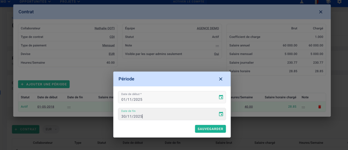 Indiquez obligatoirement la Date de début. Si c'est un CDI, il ne faut pas mettre de Date de fin. Si c'est une prime il faut mettre une Date de fin. Cliquez sur Sauvegarder.