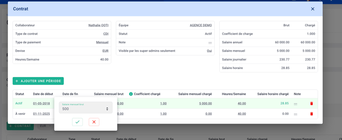 Cliquez sur le bouton + Ajouter une période pour mettre la nouvelle rémunération.