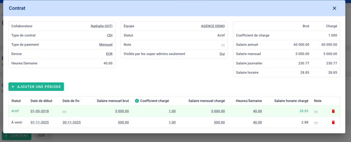 Mettez à jour le contrat avec le nouveau Salaire mensuel brut, le Coefficient chargé ou le Salaire mensuel chargé, les Heures/Semaine et le nouveau Salaire horaire chargé va se calculer automatiquement.